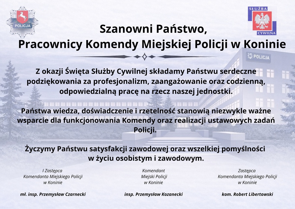 Z okazji przypadającego dziś Dnia Służby Cywilnej Komendant Miejski Policji w Koninie insp. Przemysław Kozanecki wraz z Zastępcami kierują do wszystkich Pracowników Komendy Miejskiej Policji w Koninie wyrazy uznania, podziękowania za współpracę oraz serdeczne życzenia.