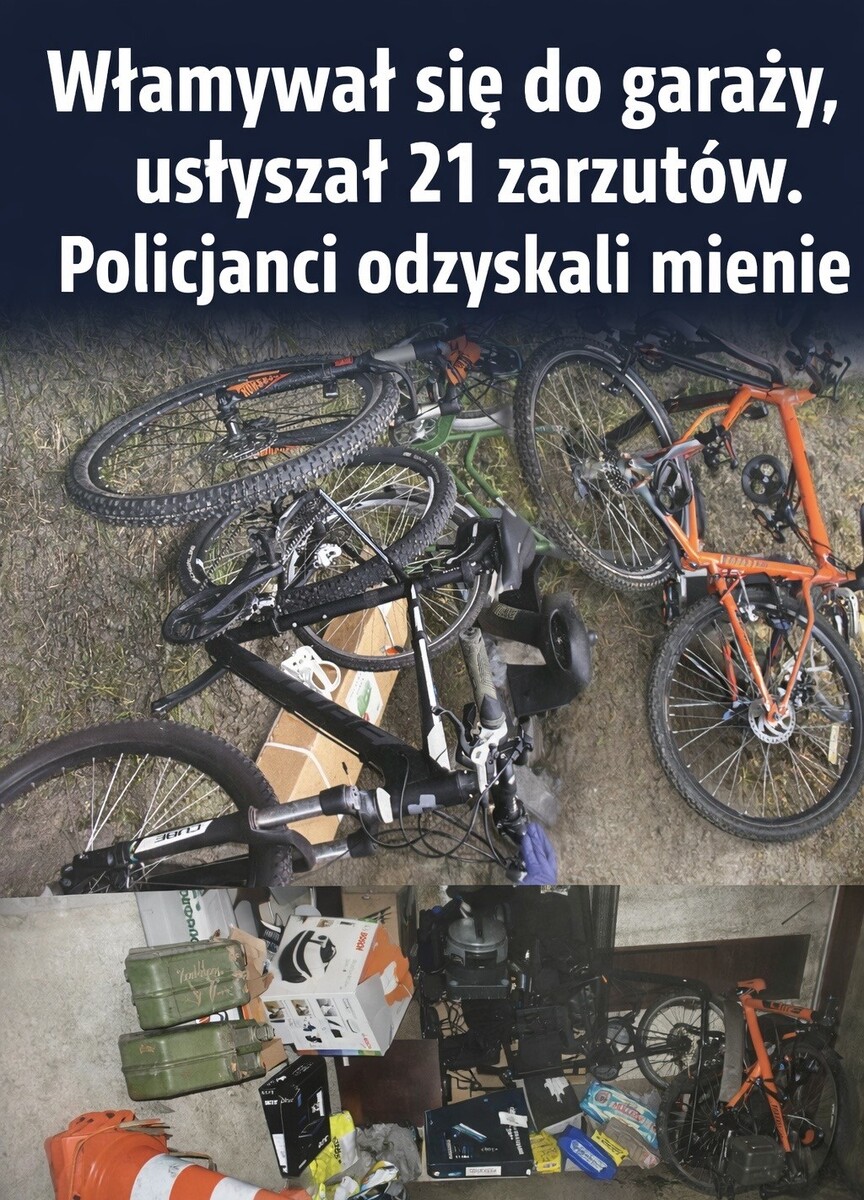22-letni mieszkaniec Konina, podejrzany o serię włamań do garaży, usłyszał 21 zarzutów. Policjanci odzyskali skradzione mienie o wartości około 20 tysięcy złotych. O jego dalszym losie zdecyduje sąd.