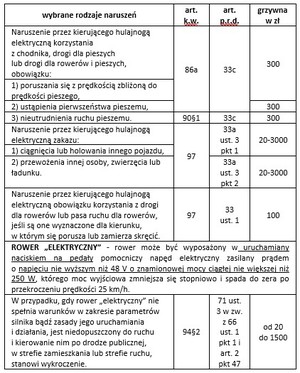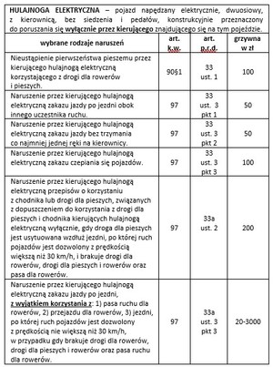 Poniżej zamieszczamy katalog najczęściej popełnianych wykroczeń przez użytkowników hulajnóg elektrycznych oraz wysokość mandatów, jakie za to grożą.